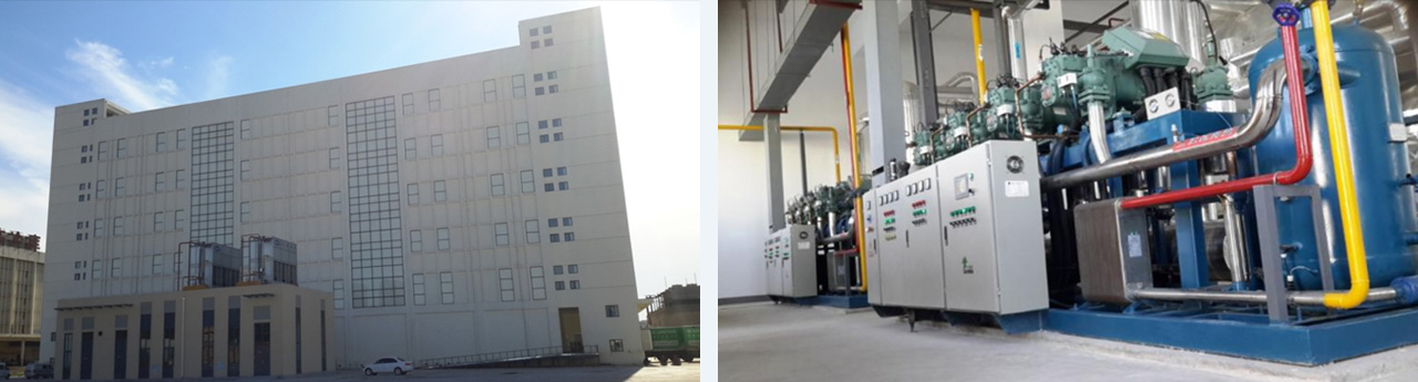 一座六層土建冷庫,總建筑面積25898㎡,總存儲噸位三萬噸,層高5.8米,共10間冷庫,采用氟利昂(R22)制冷系統,末端鋁排管,手動熱氣融霜。