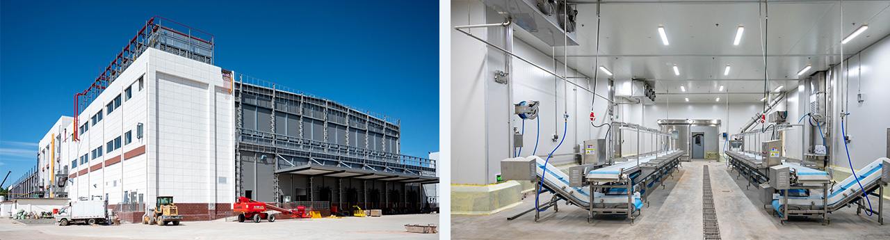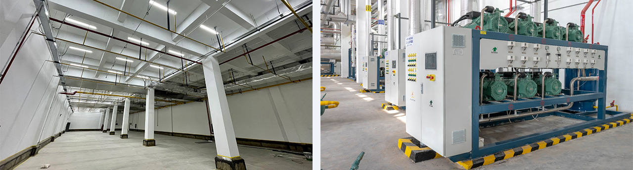 建筑面積17264㎡,層高4.2-18米,存儲噸位為6565噸,四臺速凍機配套冷源,采用氨/CO2復疊制冷,R507制冷,末端冷風機,水融霜加電化霜。位于山東省日照市,為綜合性食品加工項目,涵蓋速凍、冷藏、車間空調等生產各個環節工藝用冷。