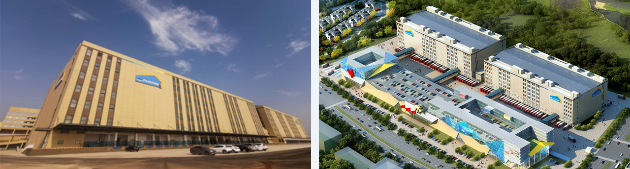 兩座七層土建冷庫,冷庫建筑面積為163094㎡,實際庫容超15萬噸。公稱容積約41萬m3,共計42個冷間,超大型CO2冷鏈綜合體,  采用R134a/CO2復疊、載冷制冷系統。末端設備采用冷風機,低溫庫采用自動水融霜,低溫穿堂采用自然融霜。另外綜合展銷區超過3700臺冷柜亦采用CO2集中供冷,世界首創。本工程以綠色節能為宗旨,提出四位一體設計理念。所謂的四位是指在本項目中,冷庫采用的制冷系統、萬噸城采用的集中冰柜系統、空調系統、熱水系統。 一體是指在冷庫、冷柜、空調、熱水各獨立子 系統之間,增加一套CO2熱泵熱 回收蓄熱裝置使整個系統聯動,實現冷熱能源高效平衡綜合利用。
